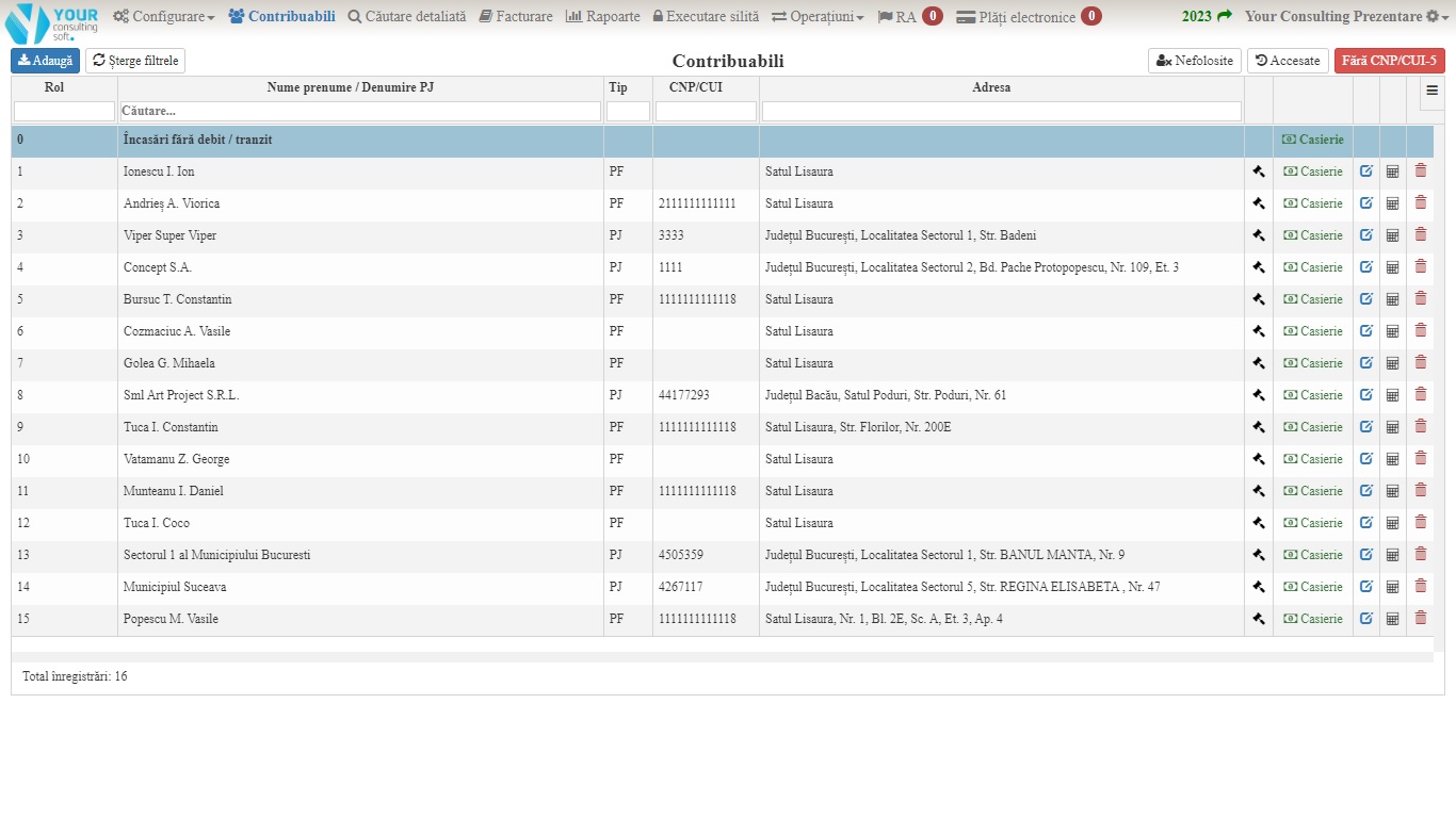Există o sortare, ordonare şi identificare după adresă, rol, nume, CNP/CUI, nefiind obligatorie introducerea a tuturor datelor de indentificare ci doar parțial;