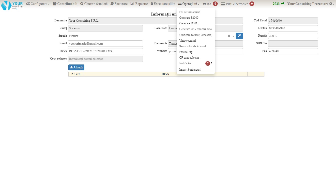 Aplicația are si o sectiune unde se generează taxele locale sau taxele configurabile, conform cu cerințele fiecărei primării în parte. (ex. Salubritate, Pază, Firmă, Activitate economică etc.)